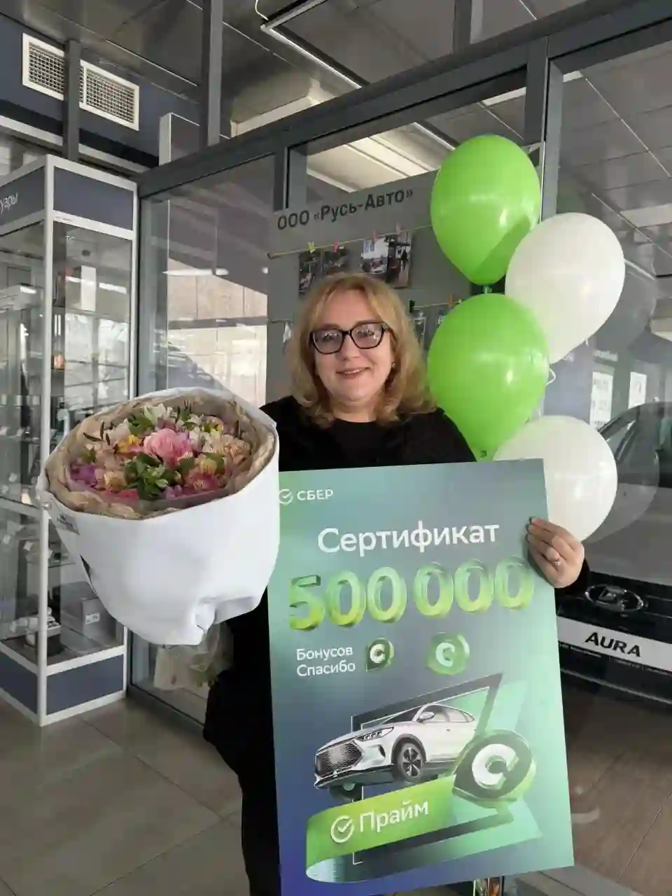 21 февраля в нашем дилерском центре прошло приятное событие. Мы вручили сертификат на 500 000 бонусов СберСпасибо Светлане Хамитовне — победительнице большой федеральной акции от СберПрайм.